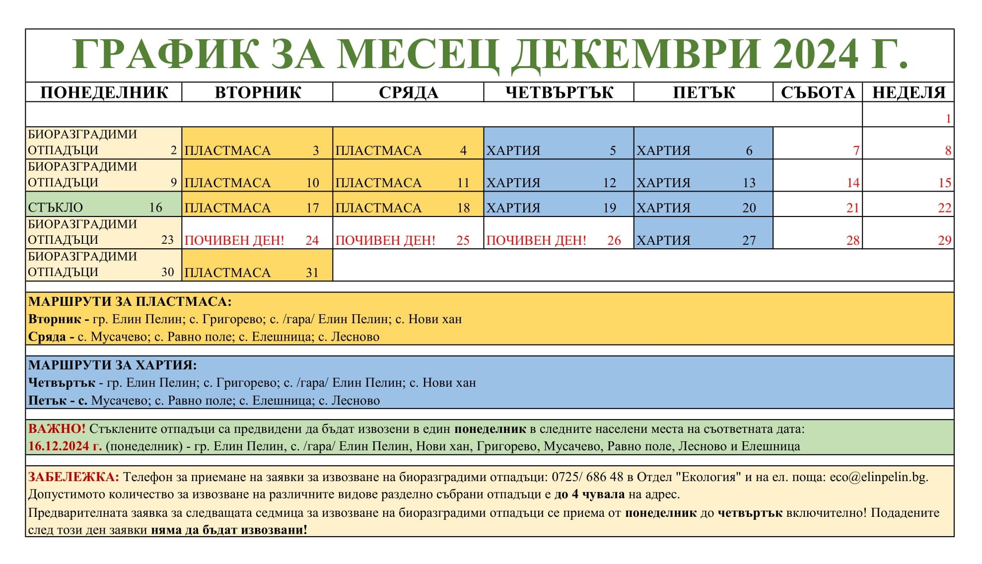 Графикът за извозване на рециклируеми отпадъци от населените места в община Елин Пелин през месец ДЕКЕМВРИ 2024 г. се изпълнява на седмична база от общинското предприятие "БКД - Елин Пелин".