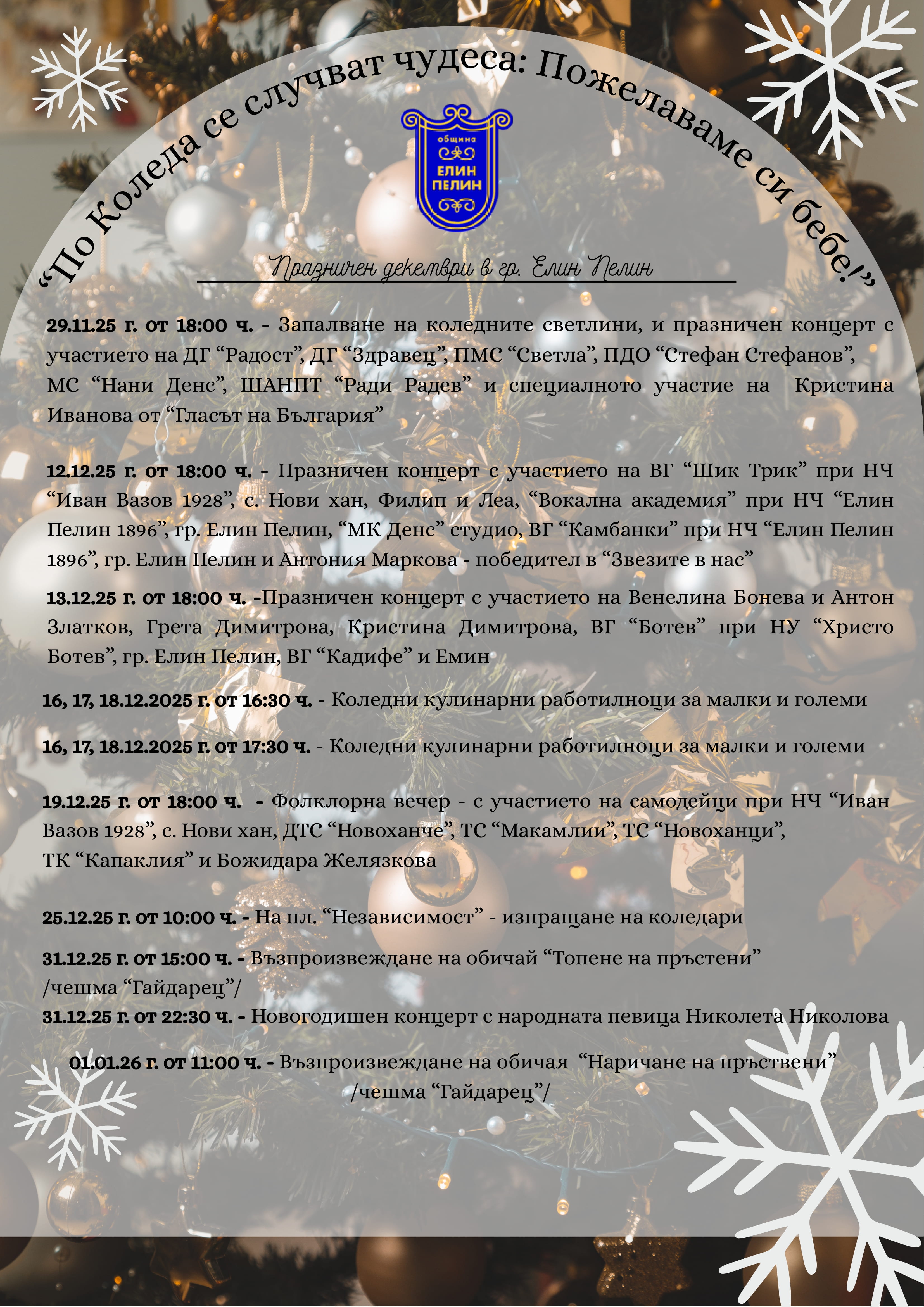 Под мотото „По Коледа се случват чудеса: Пожелаваме си бебе!“, Община Елин Пелин за поредна година обединява хората около ценностите на живота, надеждата и добротата. Коледното градче се превърна в притегателна точка за семейства от цяла България, които вярват в чудесата и силата на споделените мечти.