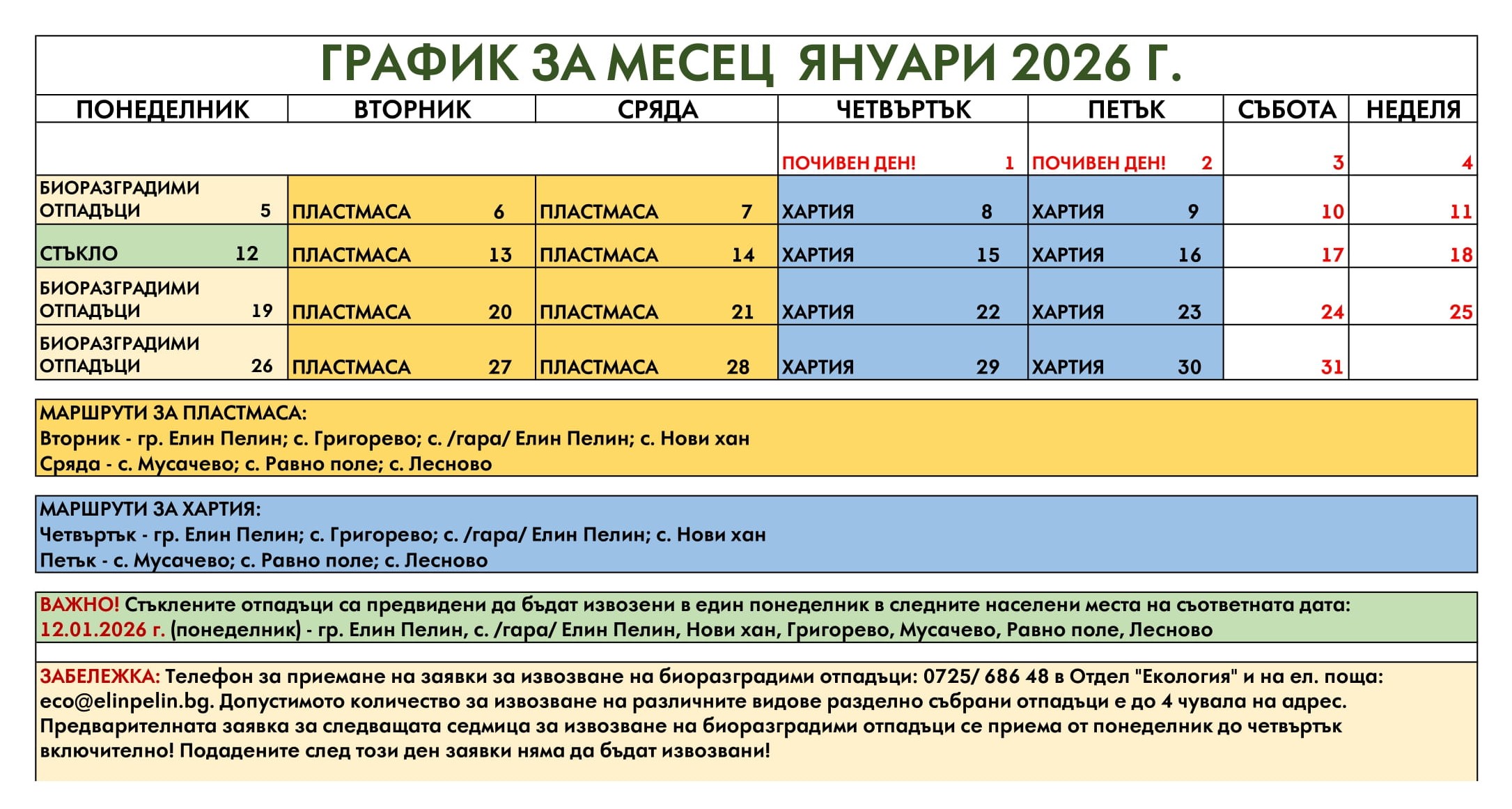 Графикът за извозване на рециклируеми отпадъци от населените места в община Елин Пелин през месец януари 2026 г. се изпълнява на седмична база от общинското предприятие "БКД - Елин Пелин".