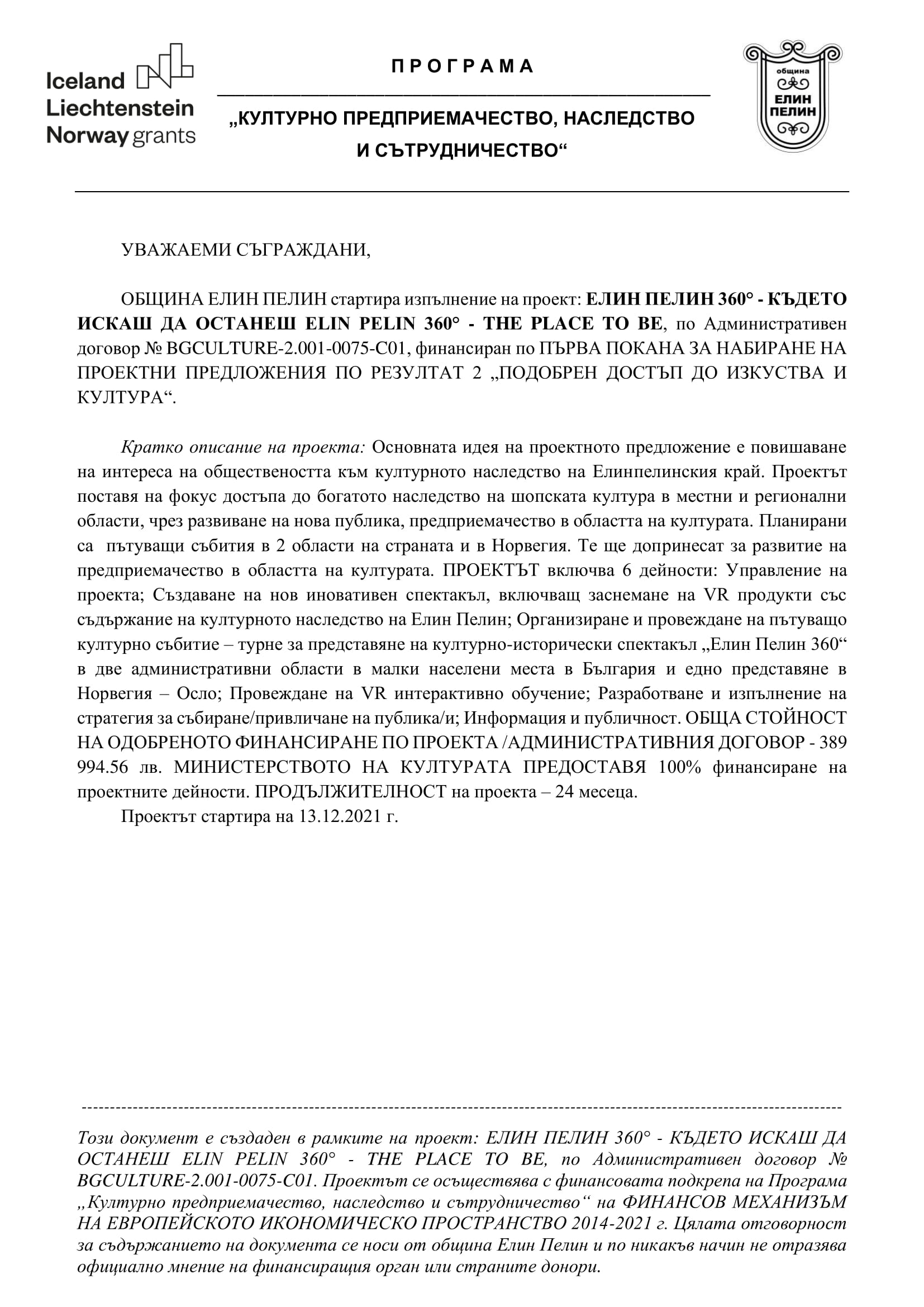 Кратко описание на проекта: Основната идея на проектното предложение е повишаване на интереса на обществеността към културното наследство на Елинпелинския край. Проектът поставя на фокус достъпа до богатото наследство на шопската култура в местни и регионални области, чрез развиване на нова публика, предприемачество в областта на културата. Планирани са пътуващи събития в 2 области на страната и в Норвегия. Те ще допринесат за развитие на предприемачество в областта на културата. ПРОЕКТЪТ включва 6 дейности: Управление на проекта; Създаване на нов иновативен спектакъл, включващ заснемане на VR продукти със съдържание на културното наследство на Елин Пелин; Организиране и провеждане на пътуващо културно събитие – турне за представяне на културно-исторически спектакъл „Елин Пелин 360“ в две административни области в малки населени места в България и едно представяне в Норвегия – Осло; Провеждане на VR интерактивно обучение; Разработване и изпълнение на стратегия за събиране/привличане на публика/и; Информация и публичност. ОБЩА СТОЙНОСТ НА ОДОБРЕНОТО ФИНАНСИРАНЕ ПО ПРОЕКТА /АДМИНИСТРАТИВНИЯ ДОГОВОР - 389 994.56 лв. МИНИСТЕРСТВОТО НА КУЛТУРАТА ПРЕДОСТАВЯ 100% финансиране на проектните дейности. ПРОДЪЛЖИТЕЛНОСТ на проекта – 24 месеца.