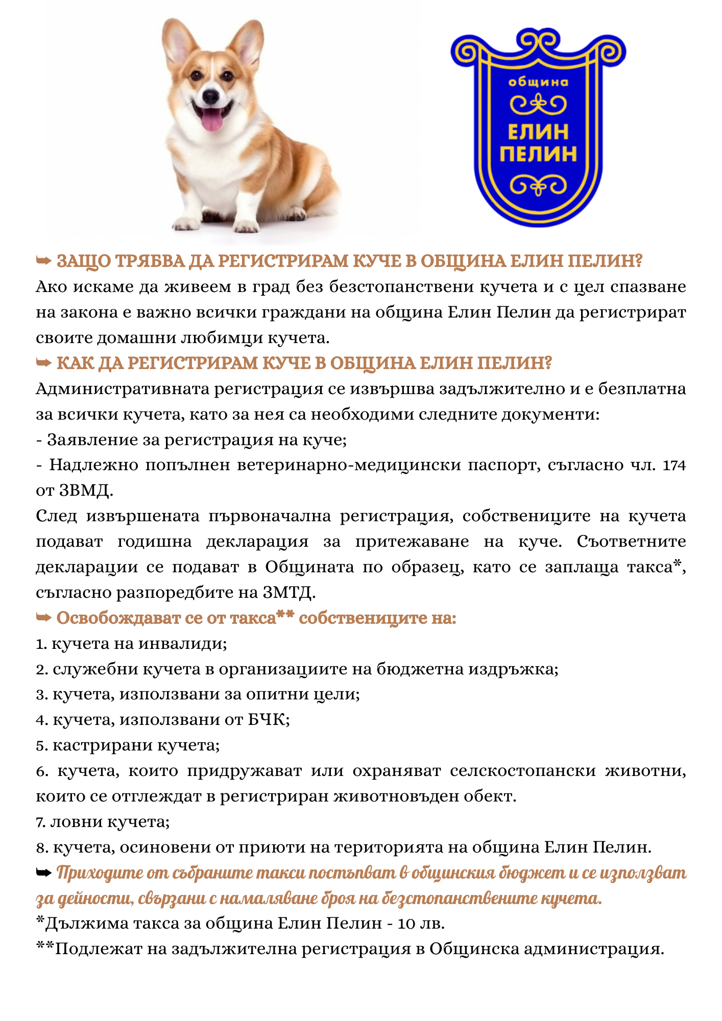 ➥ Дължимата такса в Община Елин Пелин е в размер на 10 лв. Плаща се на годишна база, като в наредбата има изключения за кастрирани кучета, ловджийски кучета, служебни кучета и др. Приходите от събраните такси постъпват в общинския бюджет и се използват за дейности, свързани с намаляването на броя на безстопанствените кучета.