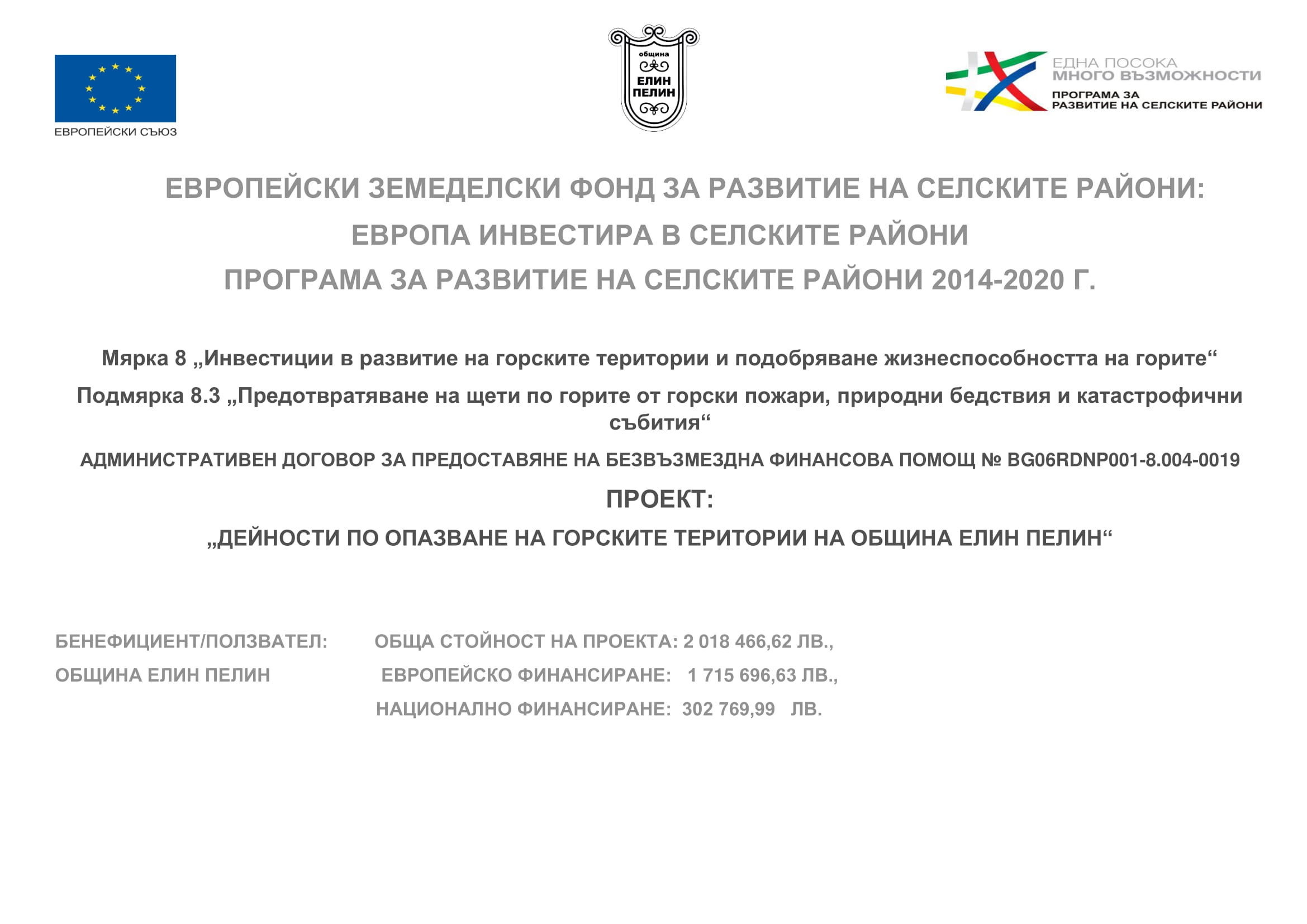 Проектът се изпълнява по Мярка 8 „Инвестиции в развитие на горските територии и подобряване жизнеспособността на горите“, Подмярка 8.3 „Предотвратяване на щети по горите от горски пожари, природни бедствия и катастрофични събития“ към Програма за развитие на селските райони 2014-2020 г.