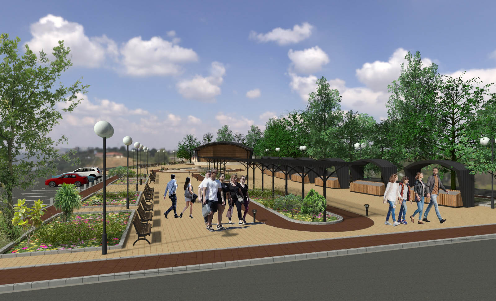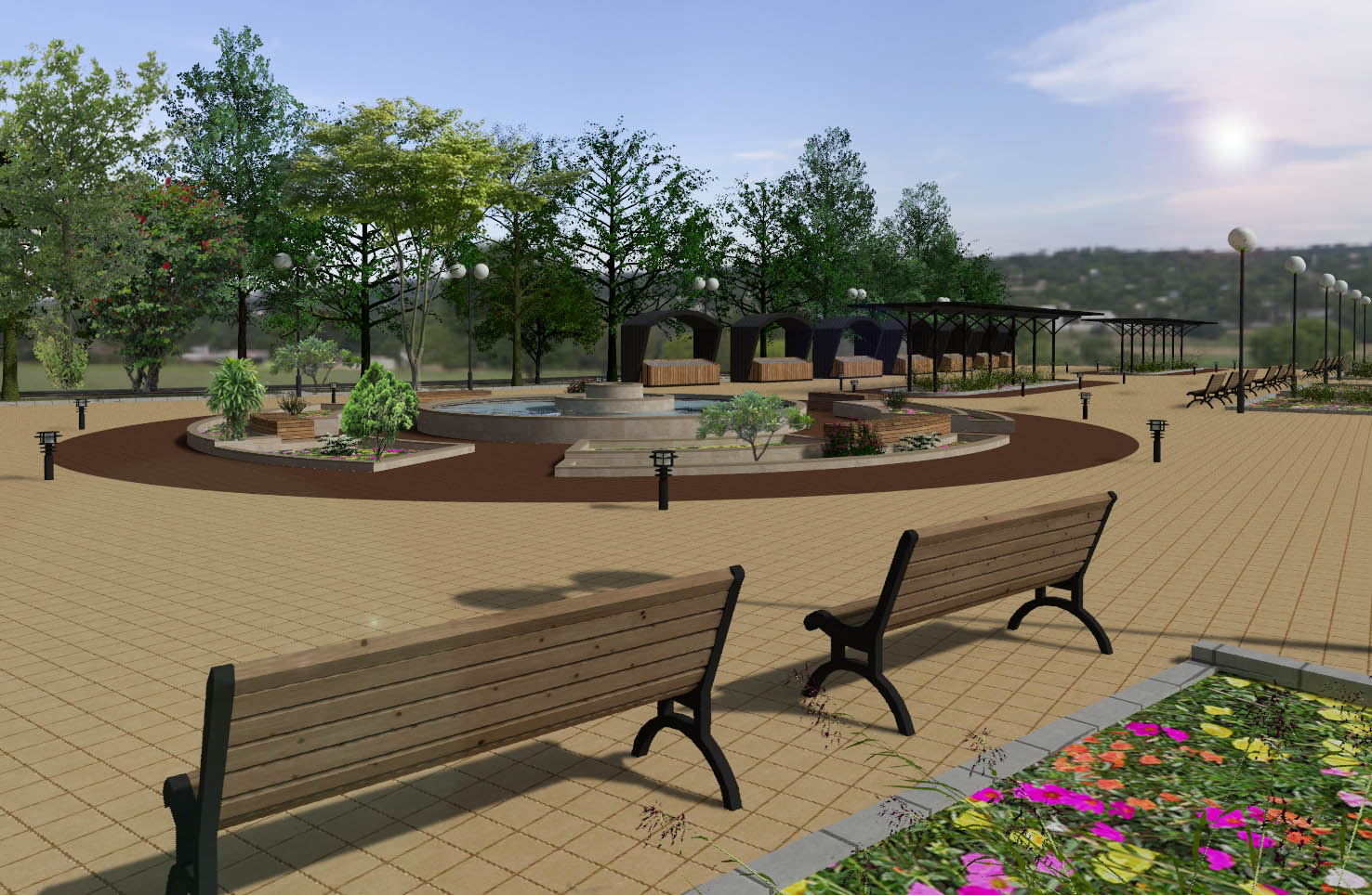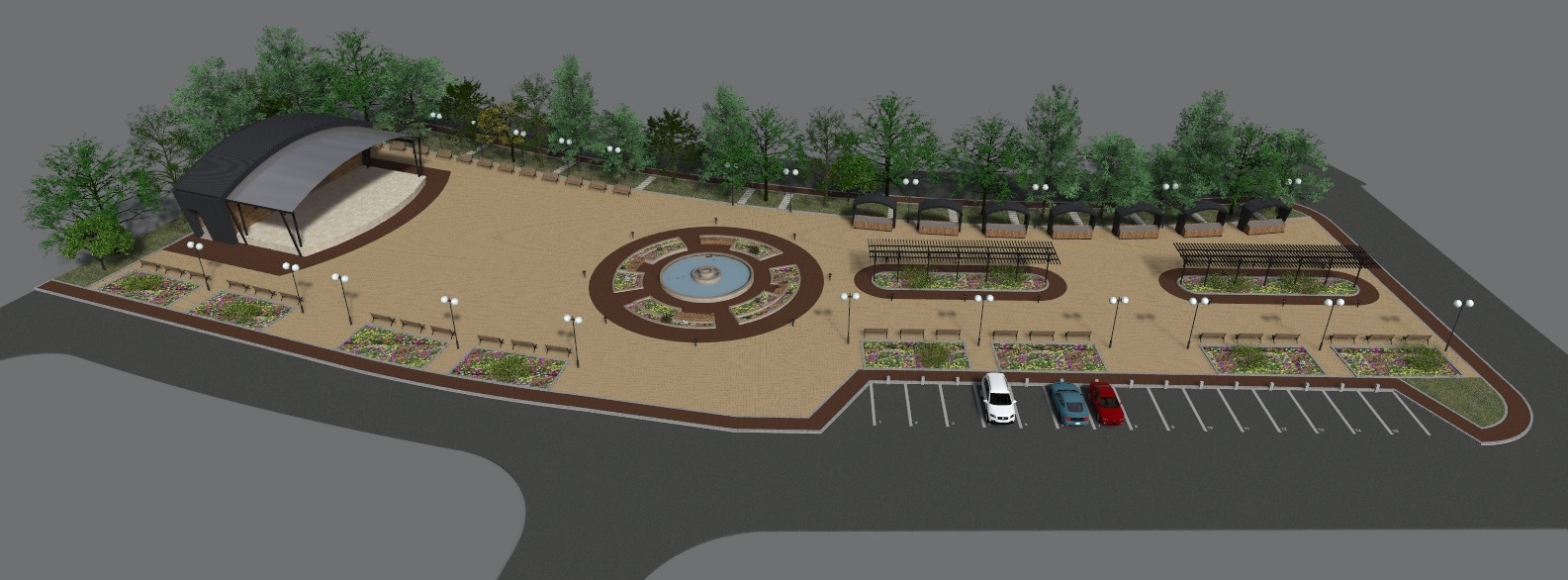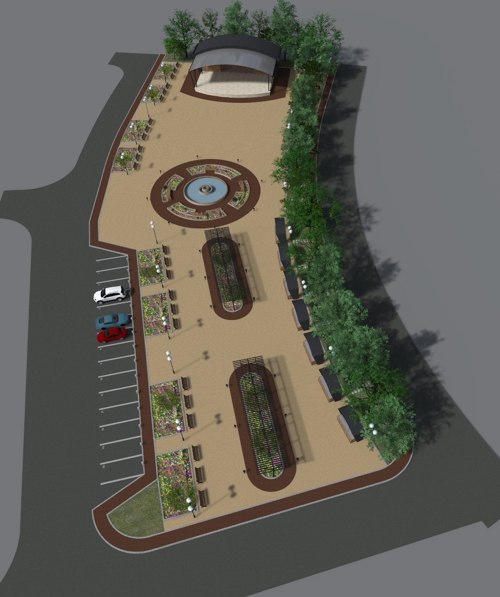 - Изграждането на централна зона включва нови пешеходни алеи, вертикална планировка, различно озеленяване на терена, проектиране на сцена за обществени мероприятия, поставяне на фонтан и перголи за увивна растителност.