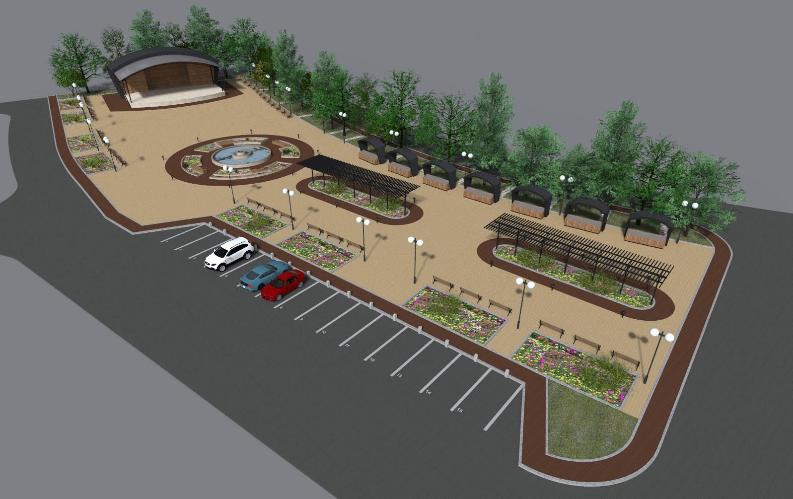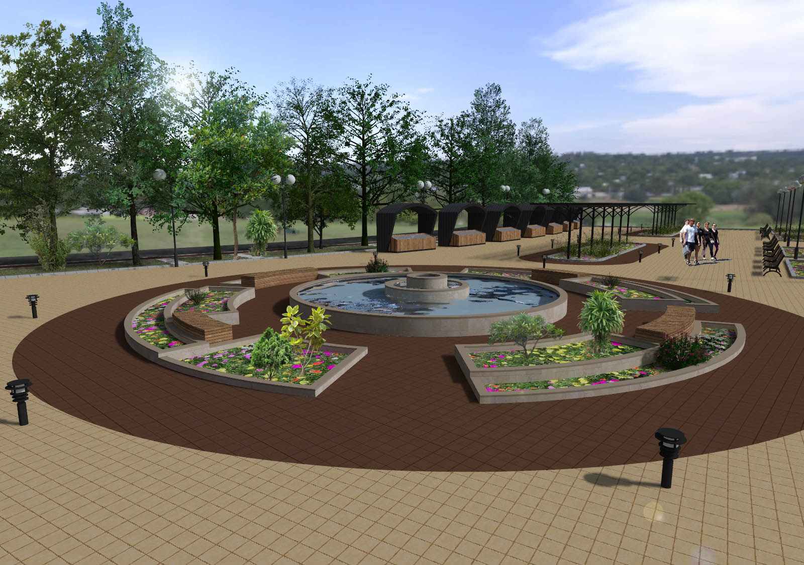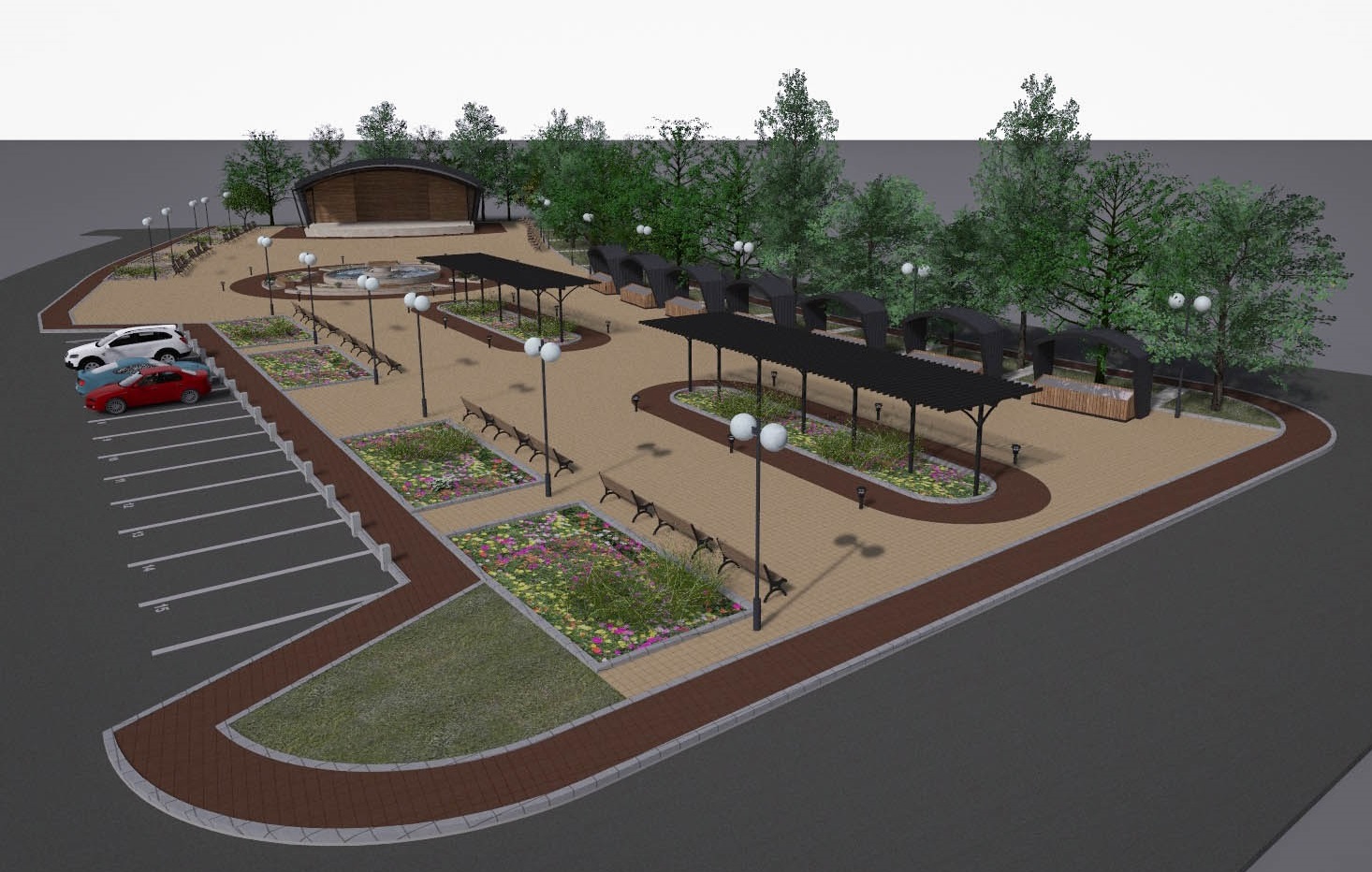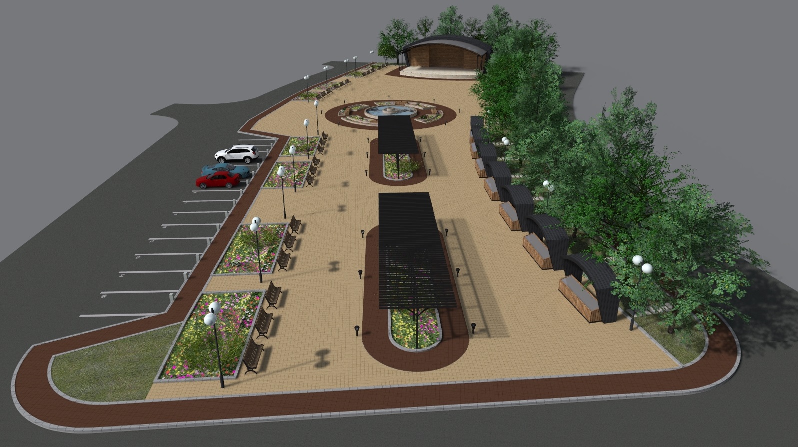 - Изграждането на централна зона включва нови пешеходни алеи, вертикална планировка, различно озеленяване на терена, проектиране на сцена за обществени мероприятия, поставяне на фонтан и перголи за увивна растителност.
