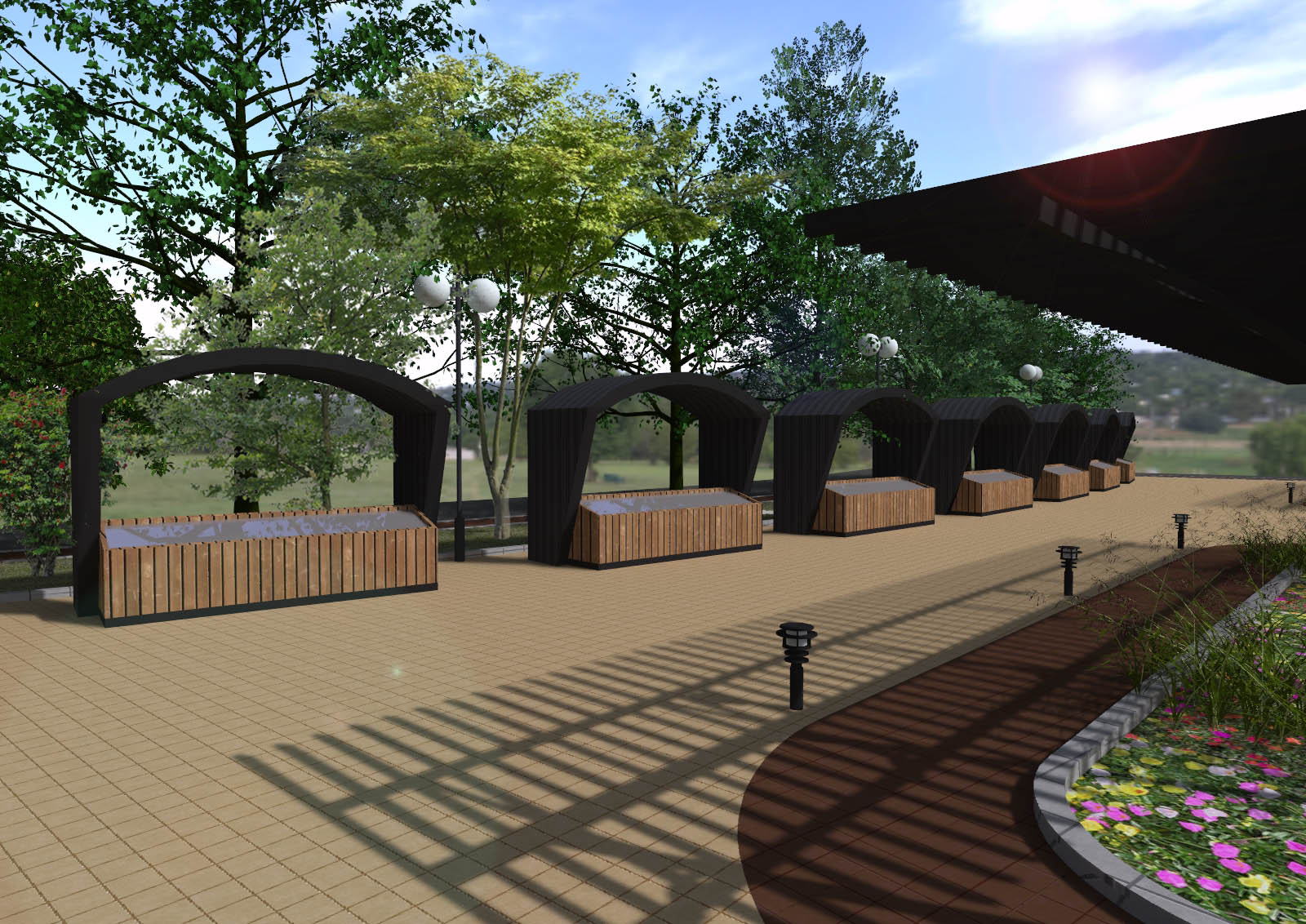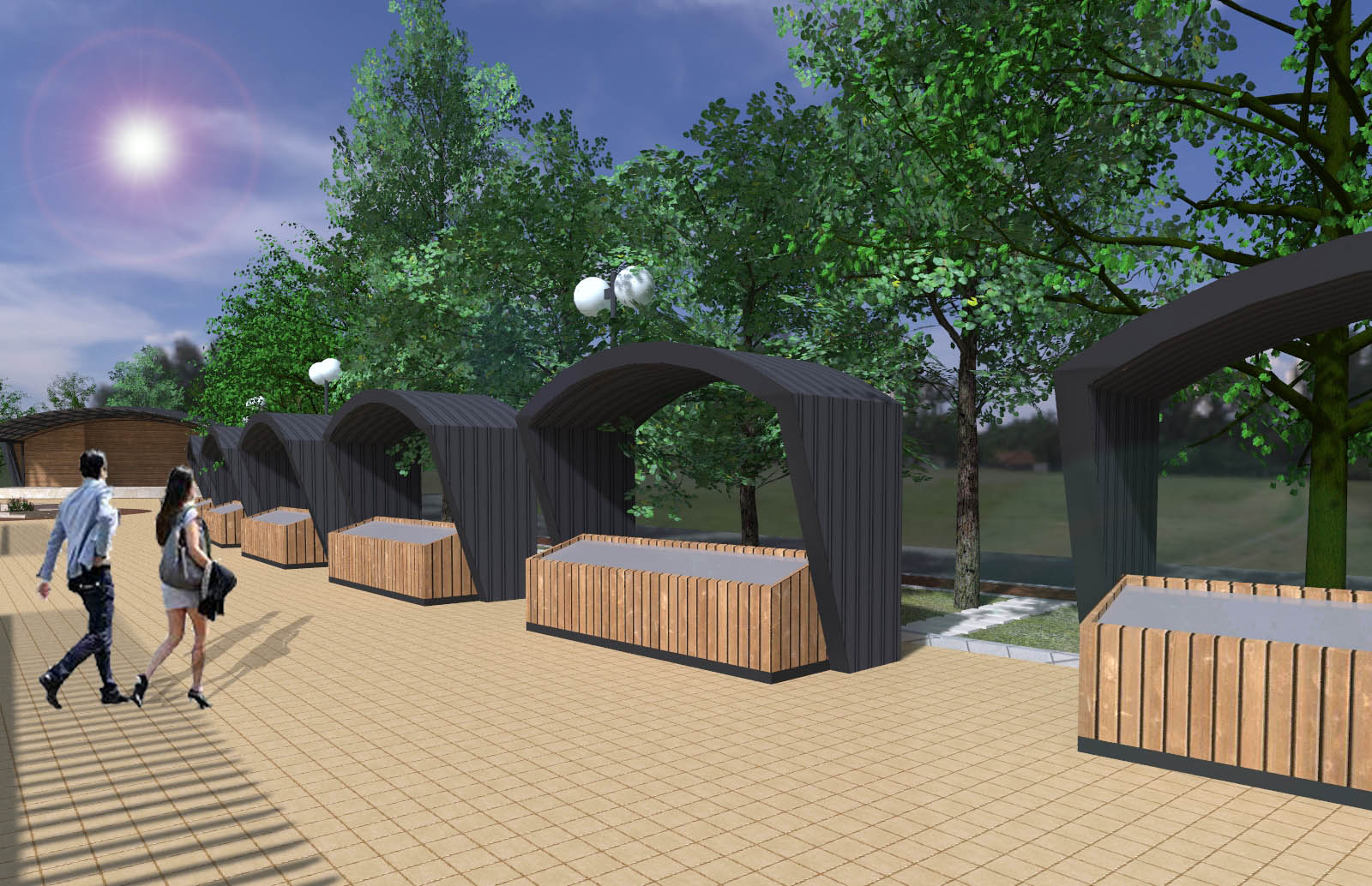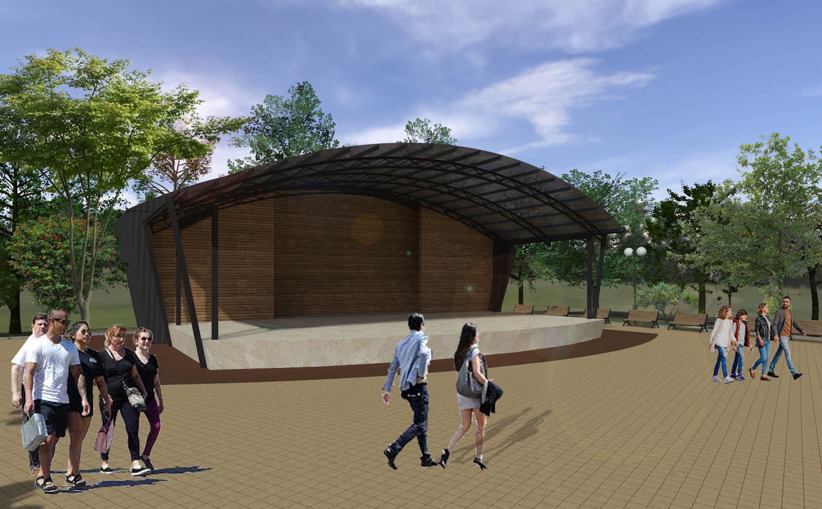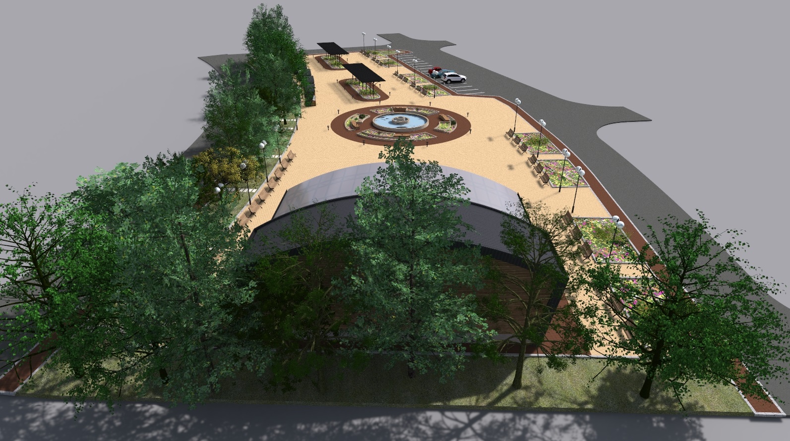 - Изграждането на централна зона включва нови пешеходни алеи, вертикална планировка, различно озеленяване на терена, проектиране на сцена за обществени мероприятия, поставяне на фонтан и перголи за увивна растителност.