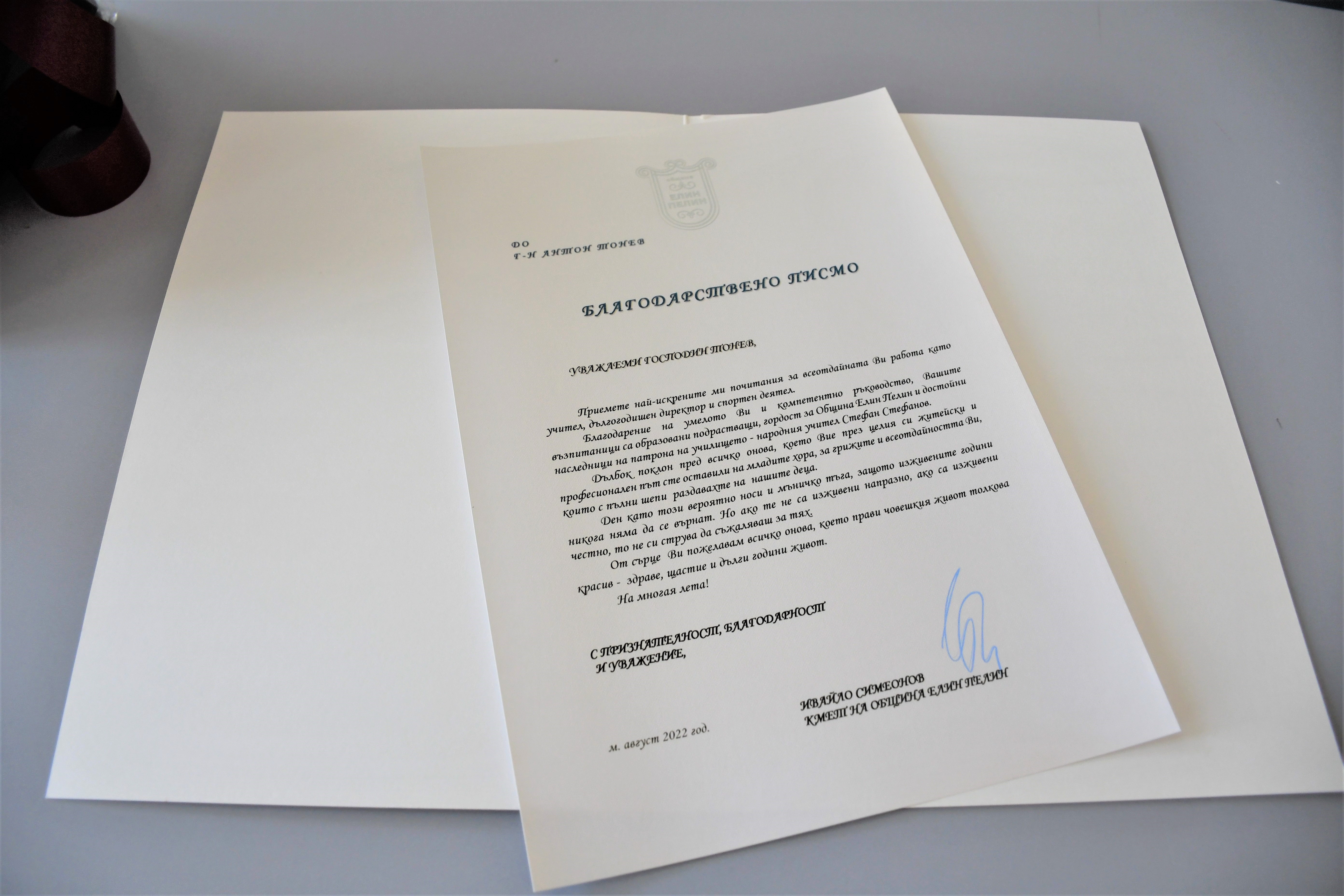 Днес г-н Антон Тонев – учител, спортен деятел и дългогодишен директор на ОУ „Стефан Стефанов“, с. /гара/ Елин Пелин получи признание за своята всеотдайност, професионализъм и дългогодишен трудов стаж от кмета на Община Елин Пелин г-н Ивайло Симеонов и неговия екип.